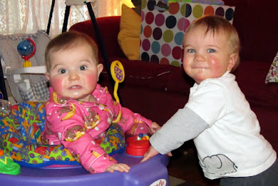 Chiara, Norah, and Luca were in town for an entire week- it was great spending time with them! Here are Lucia and Luca checking each other out. Lucia was very intrigued by Luke's ability to crawl, but the end of the week she started to wiggle herself around quite a bit (she pushes herself backwards and kind of goes in a big circle). This evening, Lucia and Ethan were in the living room, Lucia on her little pad with some toys, and Ethan in another corner putting together a puzzle. Jim and I leave the room, return a few minutes later and Lucia is over buy Ethan putting his puzzle pieces in her mouth. We ask Ethan how she made it over to him "um- she was over there (pointing to her play area), and now she is over here." Yes, we know- but HOW did she get over to you? He doesn't give us a straight answer and Lucia just looks at us waiting for us to leave the room so she can go back to her stealth baby moves!